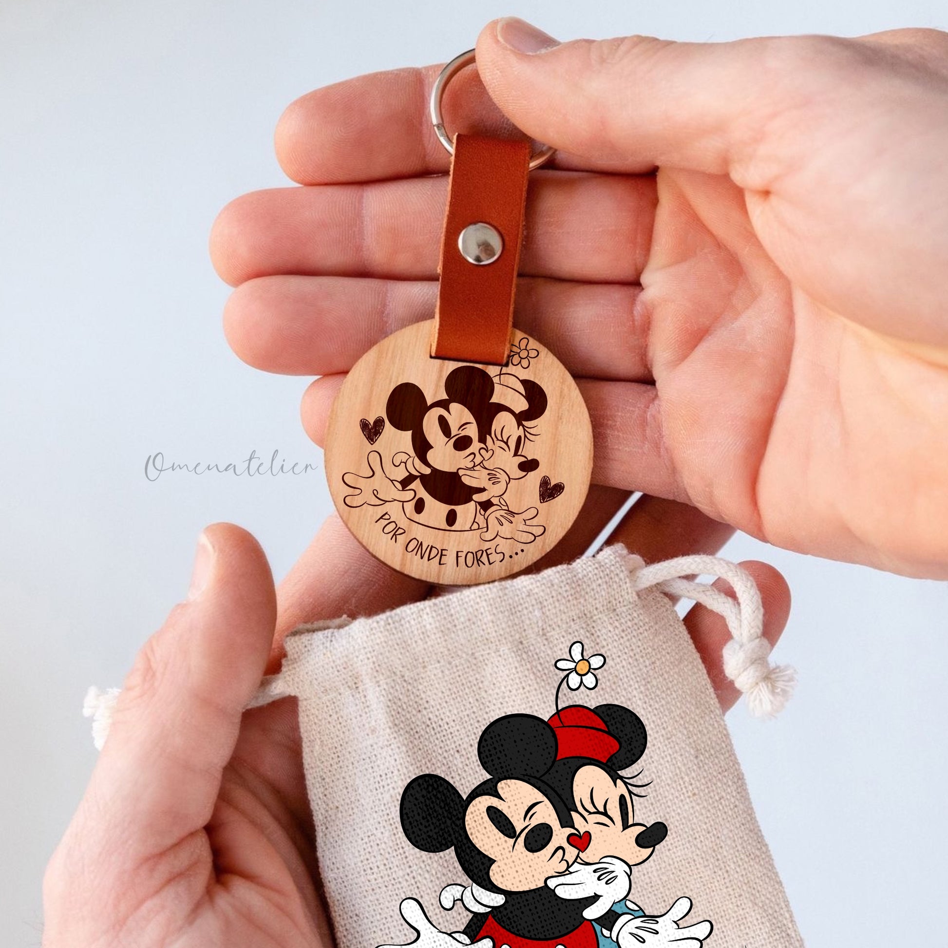 Conjunto de 2 chaveiros em madeira personalizados, com tira de pele e argola. Saco de algodão personalizado incluído.