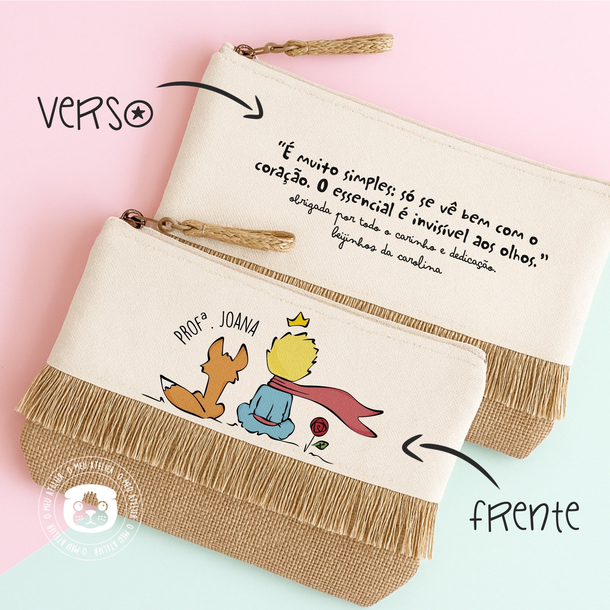 Necessaire em algodão e juta, com ilustração do Pequeno Príncipe.