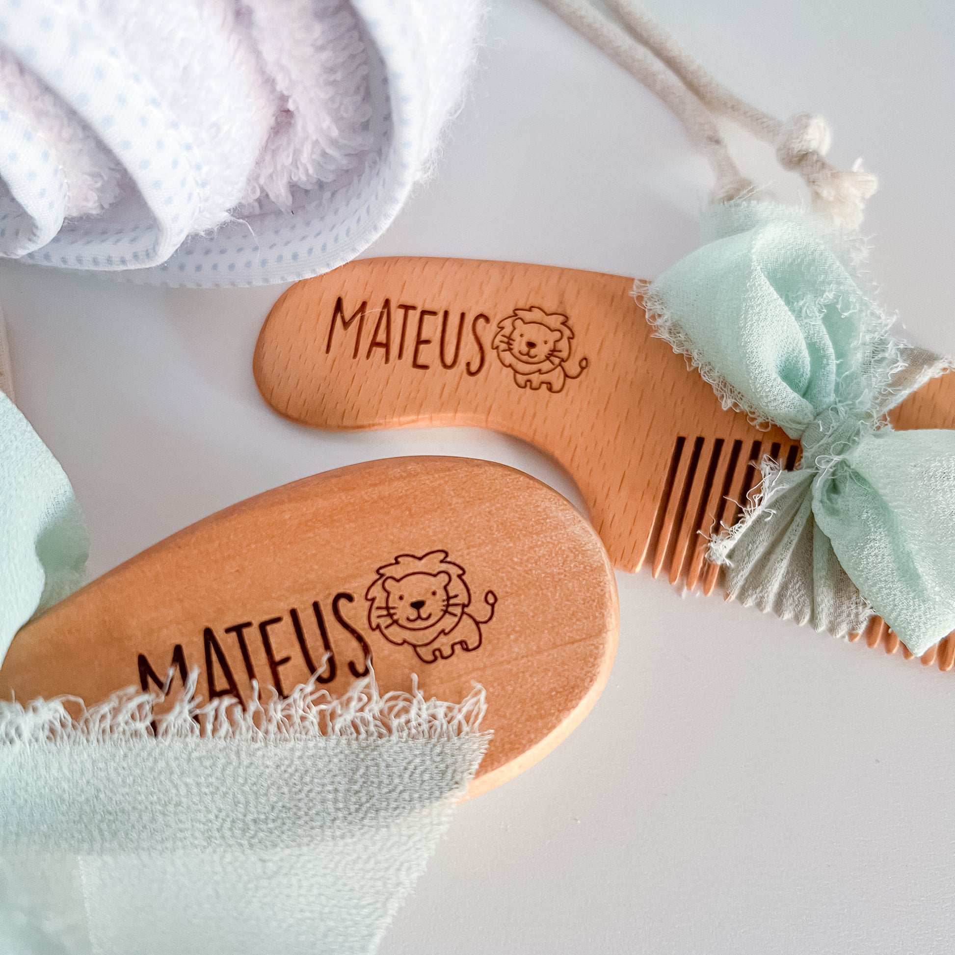🪥 Escova e pente em madeira gravados a laser com o nome da criança e um laço delicado que adiciona um toque especial.