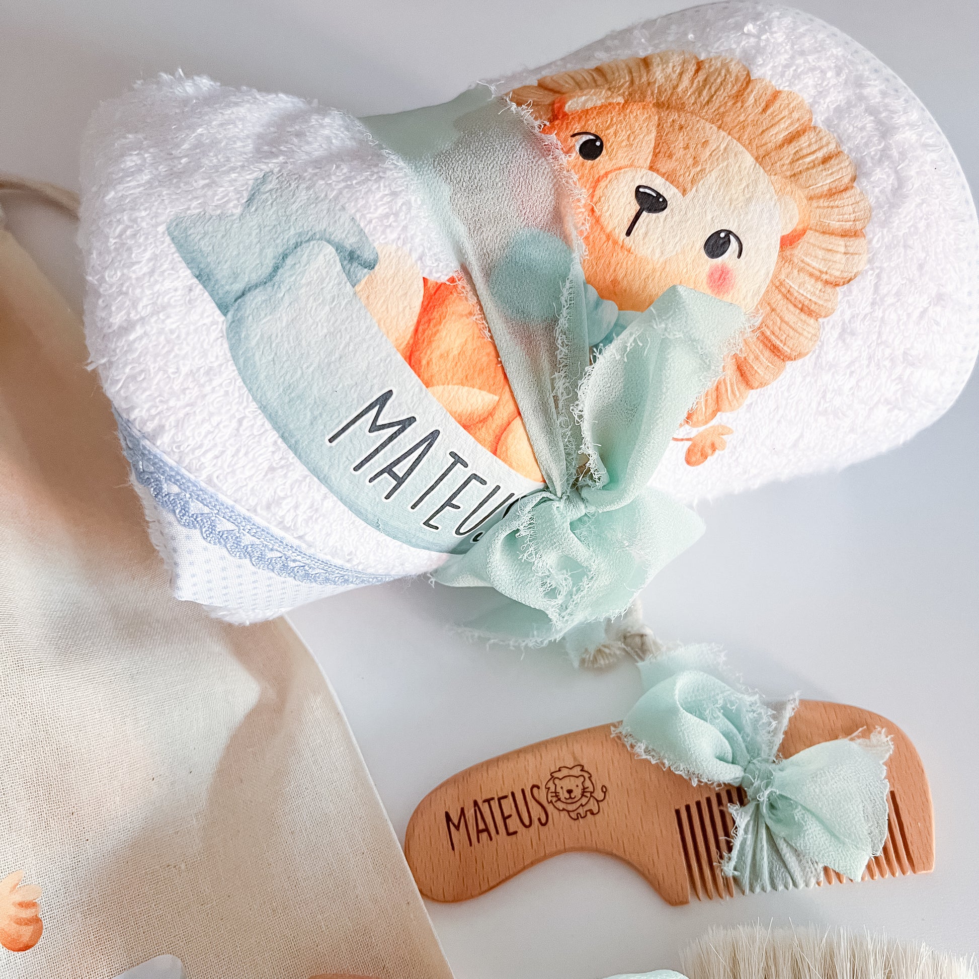 Kit Presente Personalizado Leão – Toalha, Saco, Escova e Pente com Nome